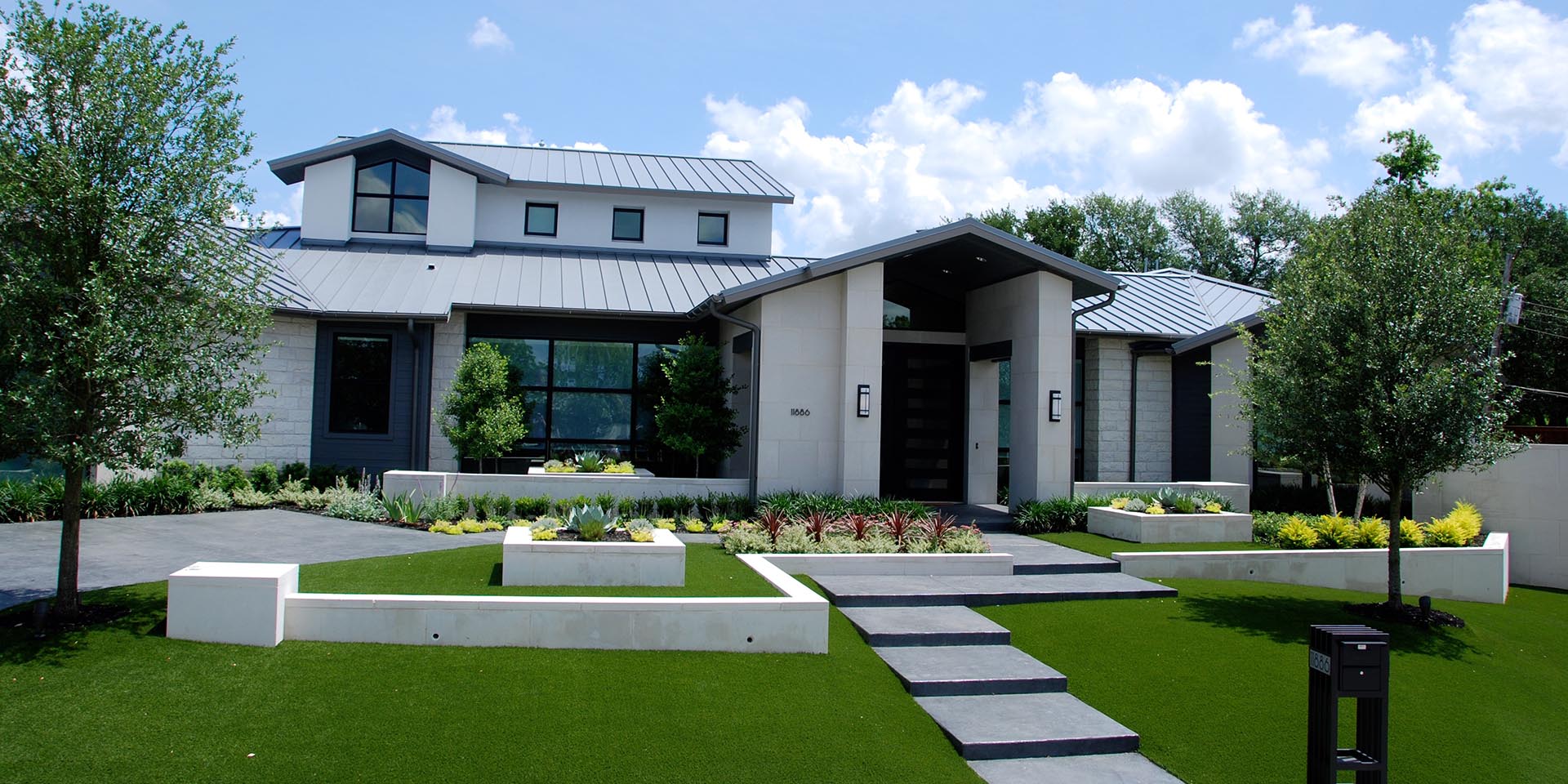 Our deisgn included modern stone wall framing the motor court which was carried into the backyard with a modern stone seating wall and interier lawn meadow.