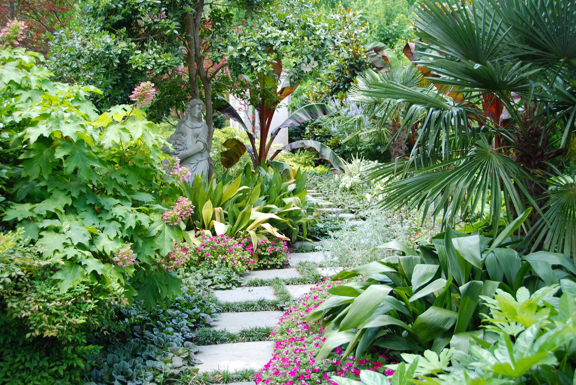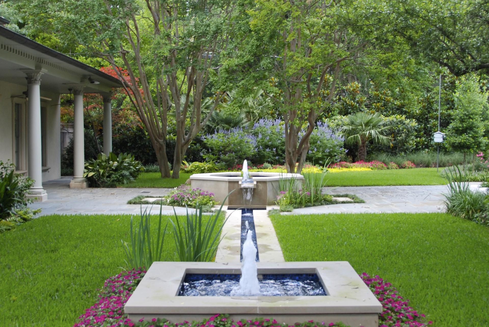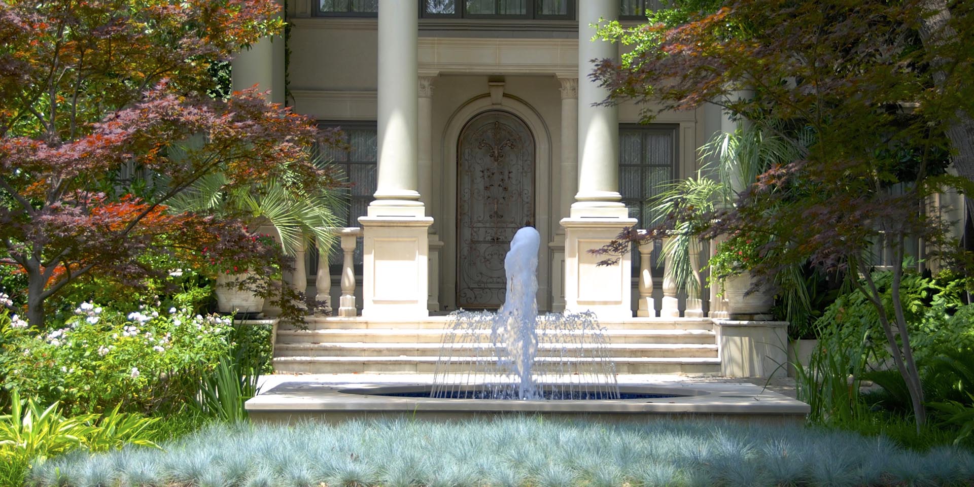 The landscape renovation of this Classic Formal home has its roots in the deep south with soft texture plantings with contrasting color folage.