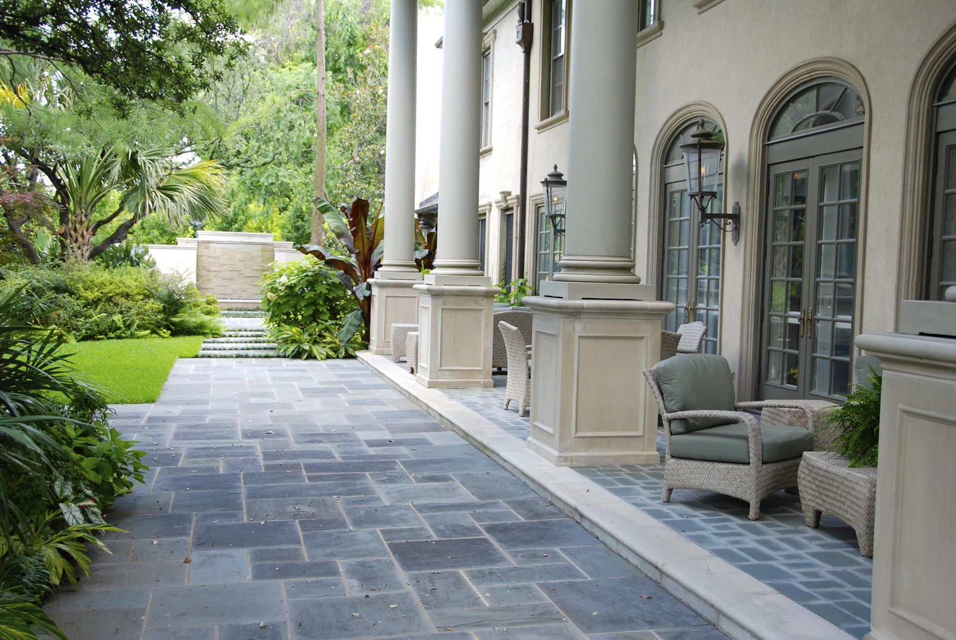The landscape renovation of this Classic Formal home has its roots in the deep south with soft texture plantings with contrasting color folage.